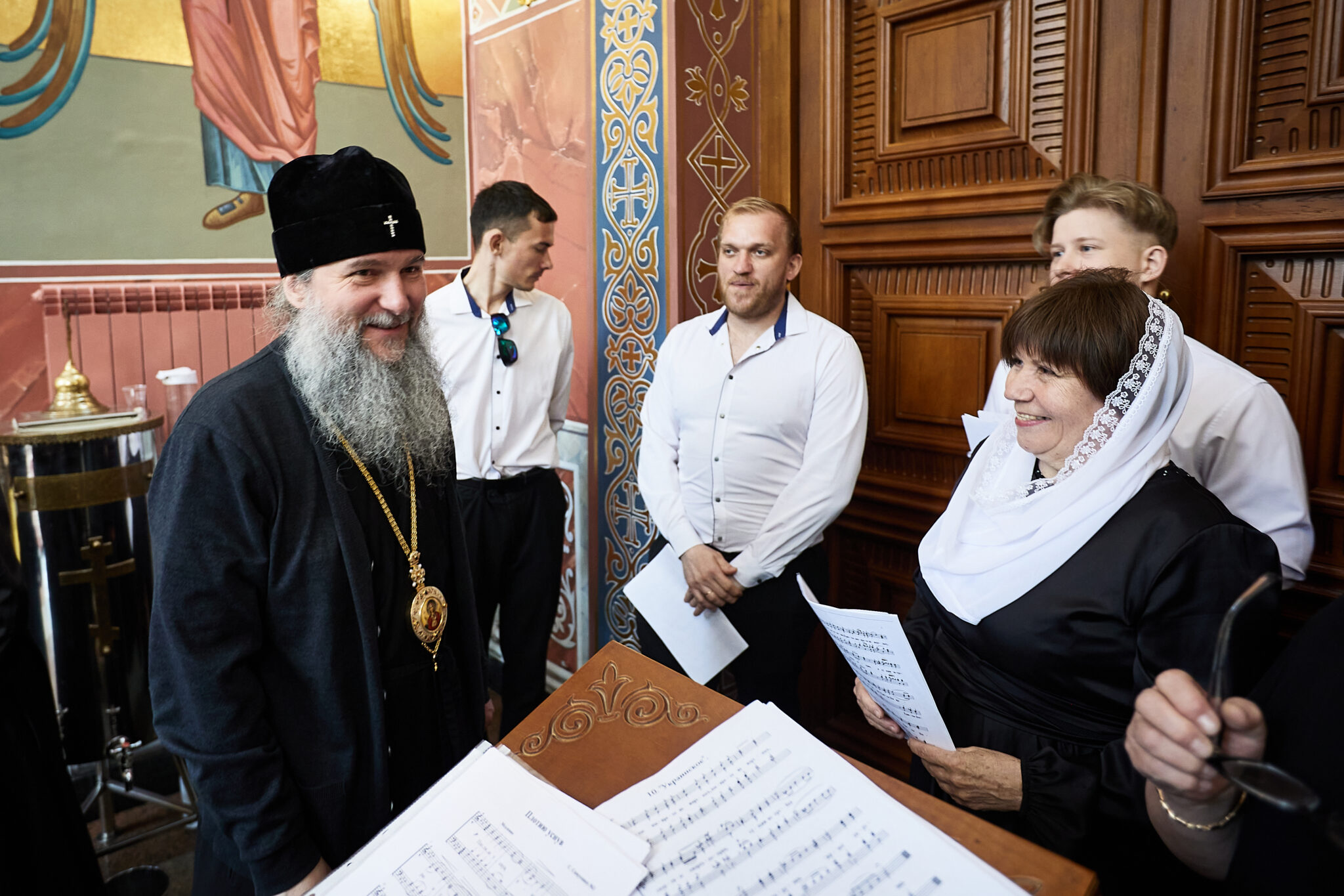 В храме Всех святых архипастыри помолились в алтаре, осмотрели храм. Архиерейский хор под управлением регента Марии Зимовец торжественно исполнили Пасхальные песнопения.