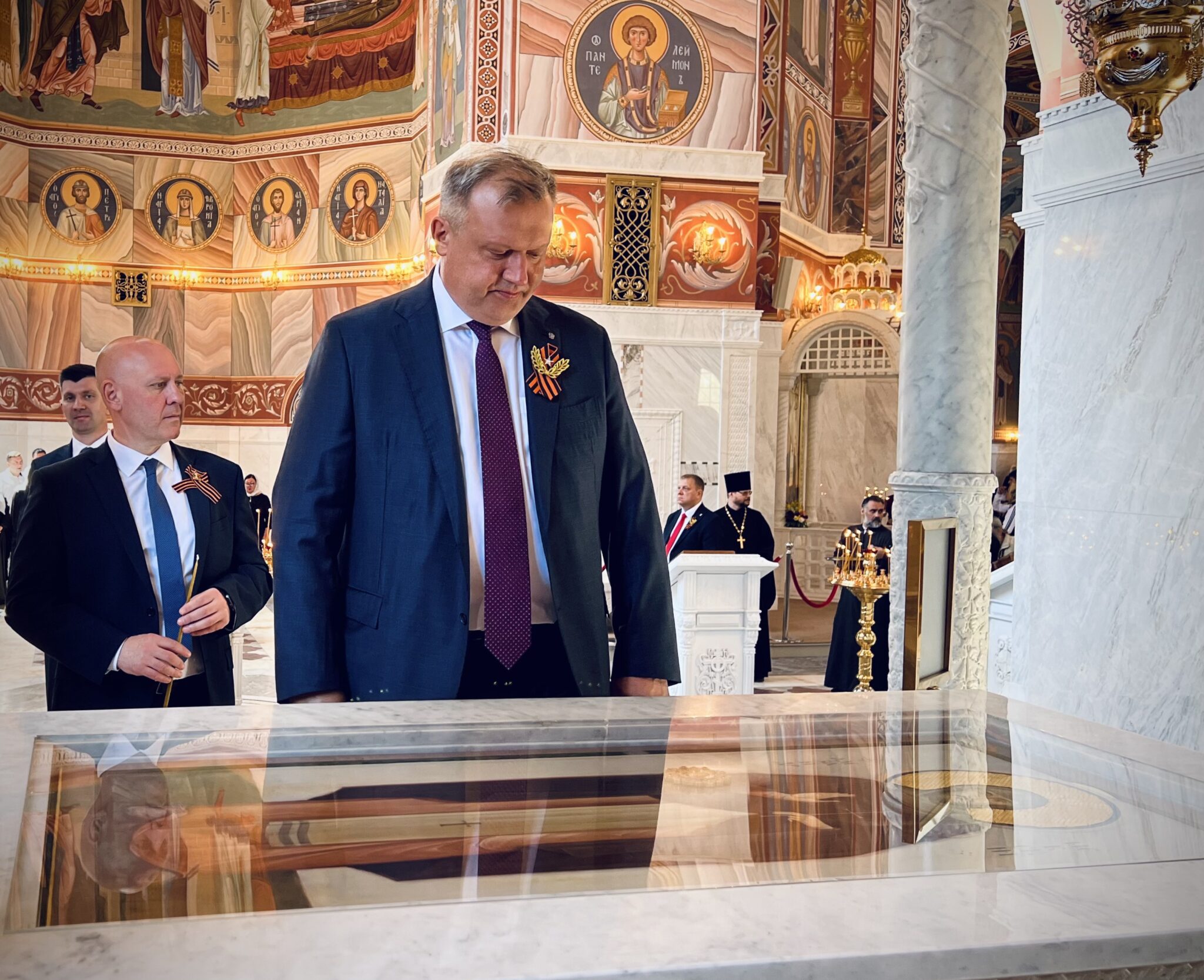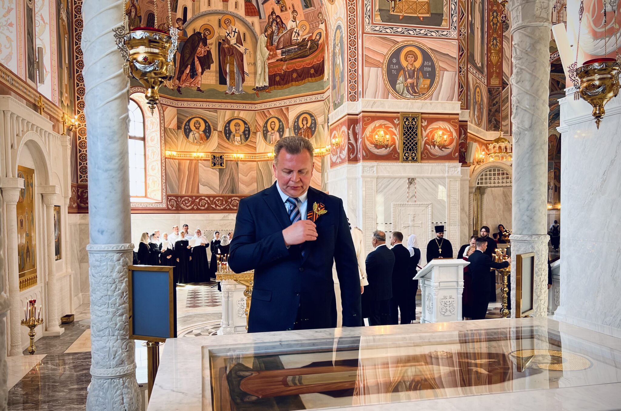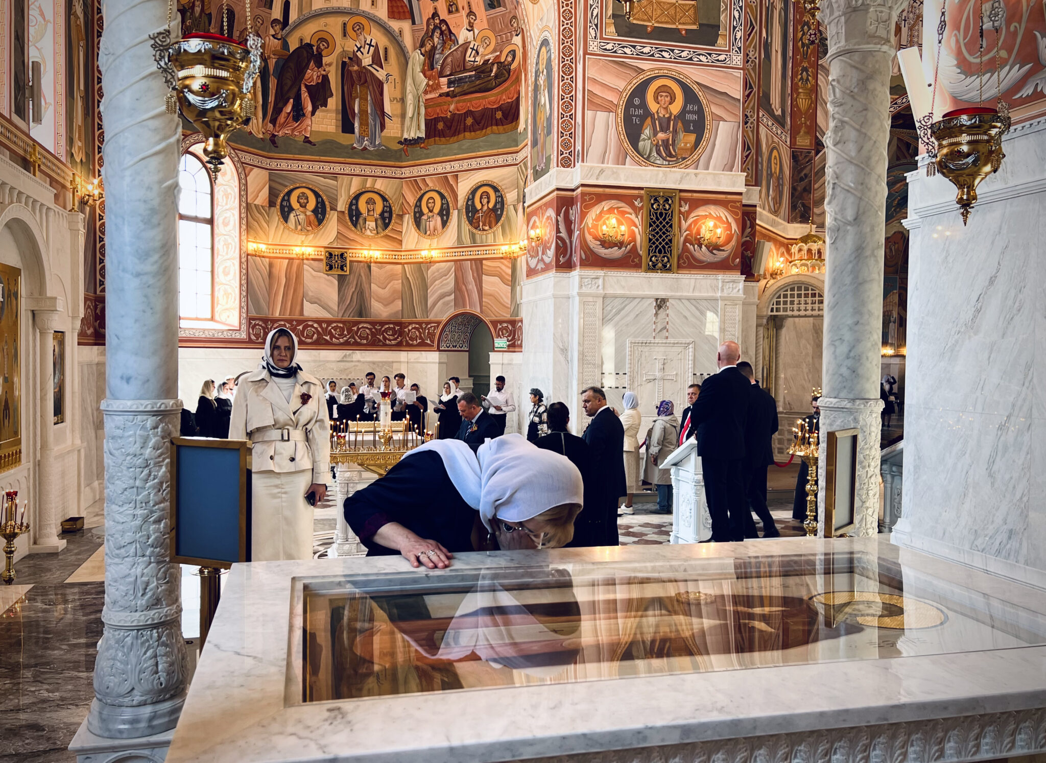 Была проведена экскурсия по главному храму города, члены делегации помолились у мощей святого князя Александра Невского и священномученика Николая Попова, поставили свечи.