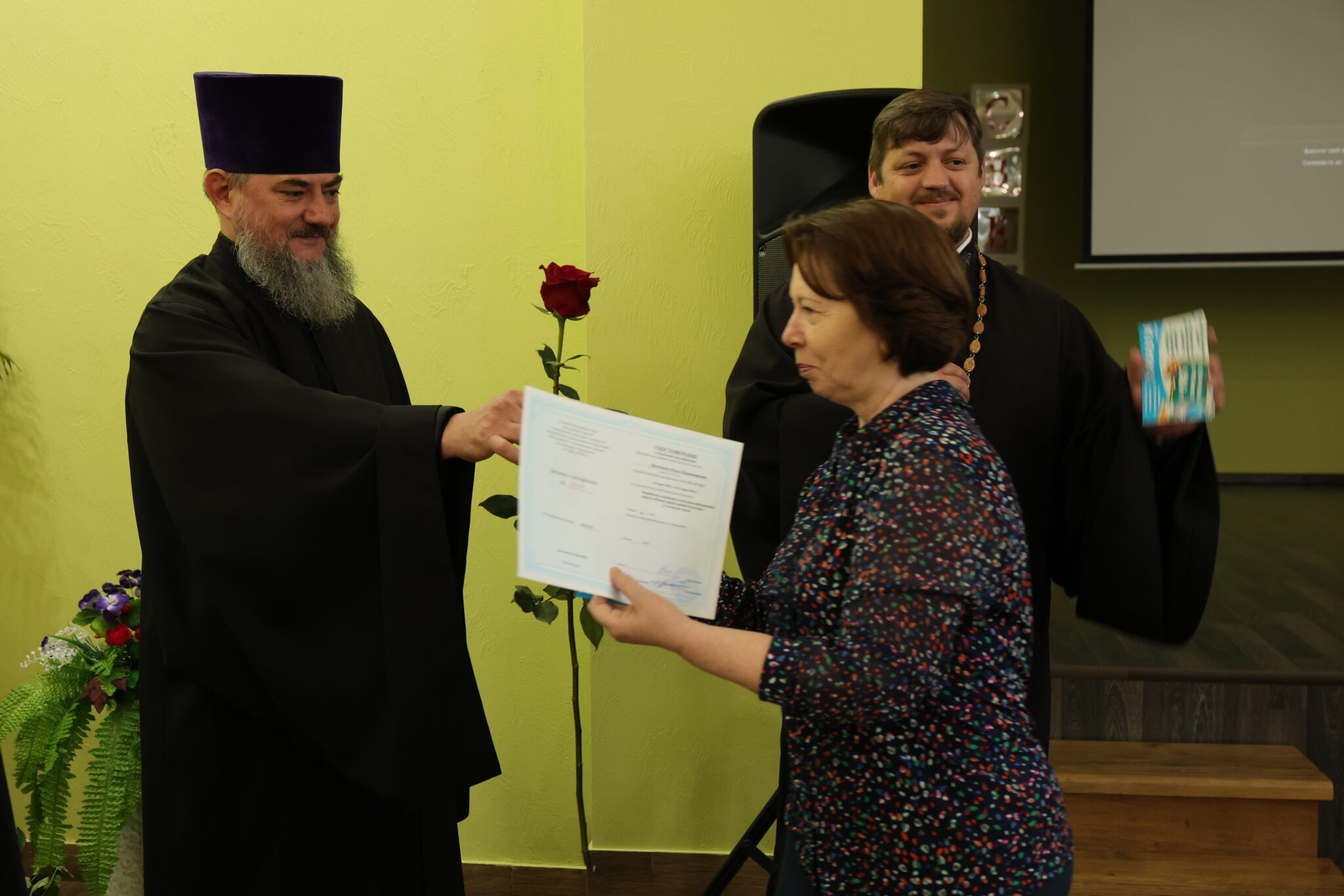 Благочинный Камышинского округа протоиерей Анатолий Карпец поздравил учителей с окончанием обучения и выразил надежду на их участие в развитии преподавания предмета. Полежаев Д.В., доктор философских наук, профессор, заведующий кафедрой педагогики и воспитательной деятельности ВГАПО, заверил слушателей в дальнейшее поддержке со стороны академии. Слушателям были вручены удостоверения, подарочные сертификаты в магазин канцтоваров и цветы.