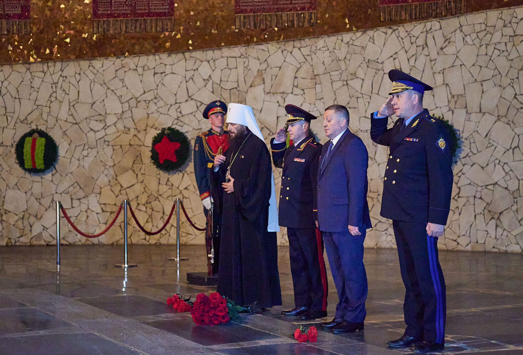 В памятном мероприятии приняли участие губернатор Волгоградской области Андрей Иванович Бочаров, руководители правоохранительных органов и силовых ведомств, курсанты Волгоградской академии МВД России, воспитанники спортивно-патриотического лагеря «Авангард», кадеты.