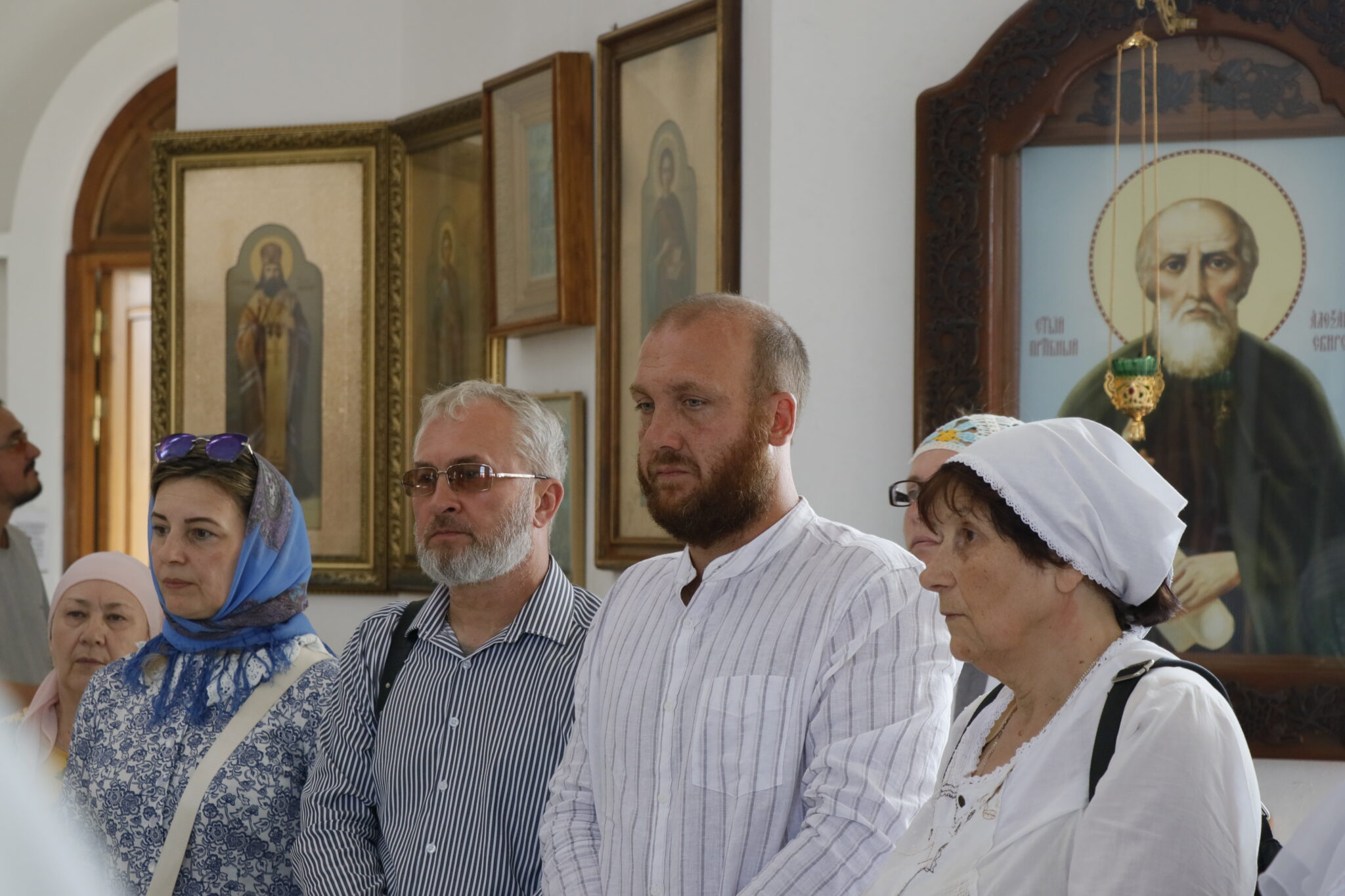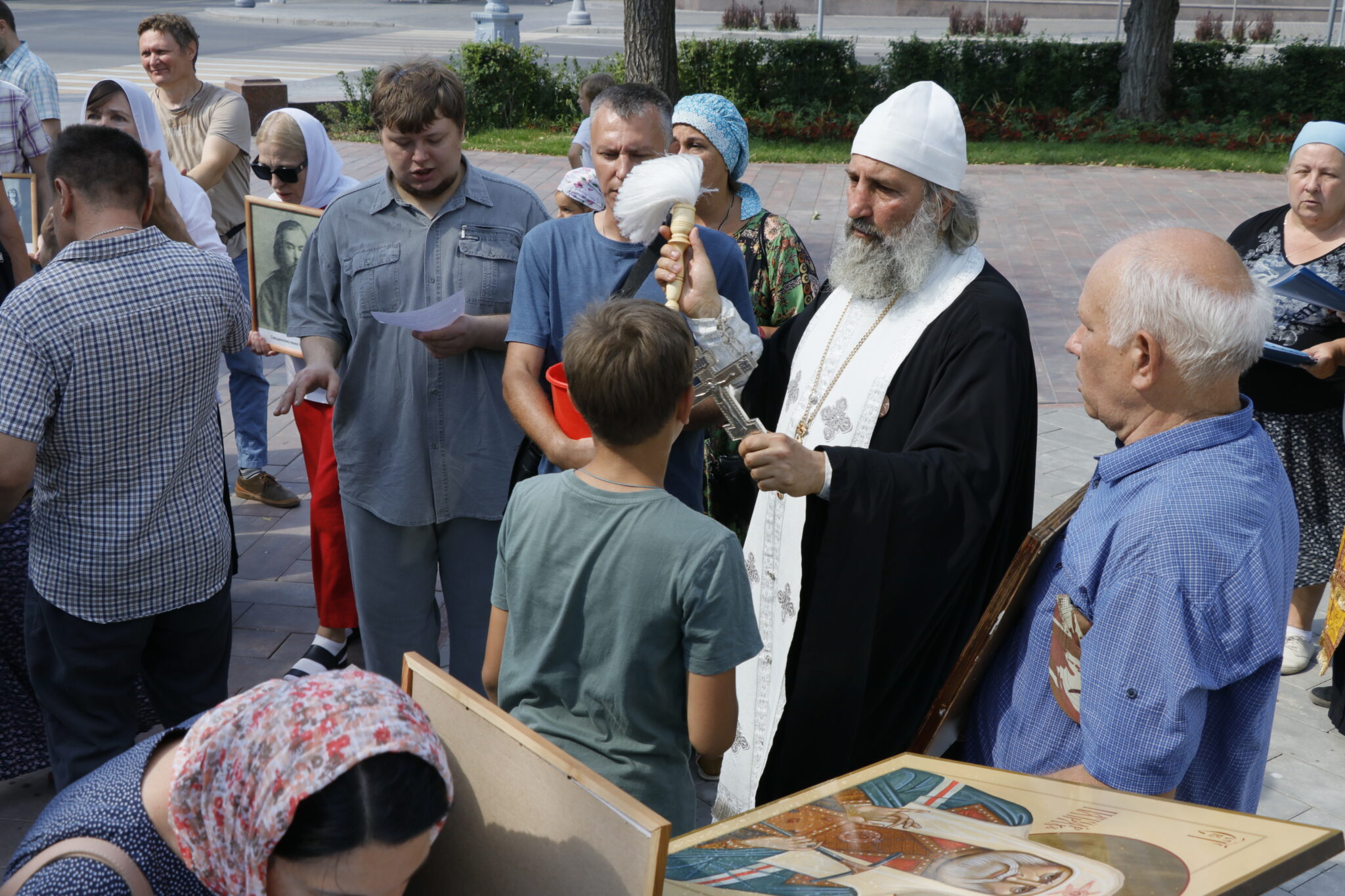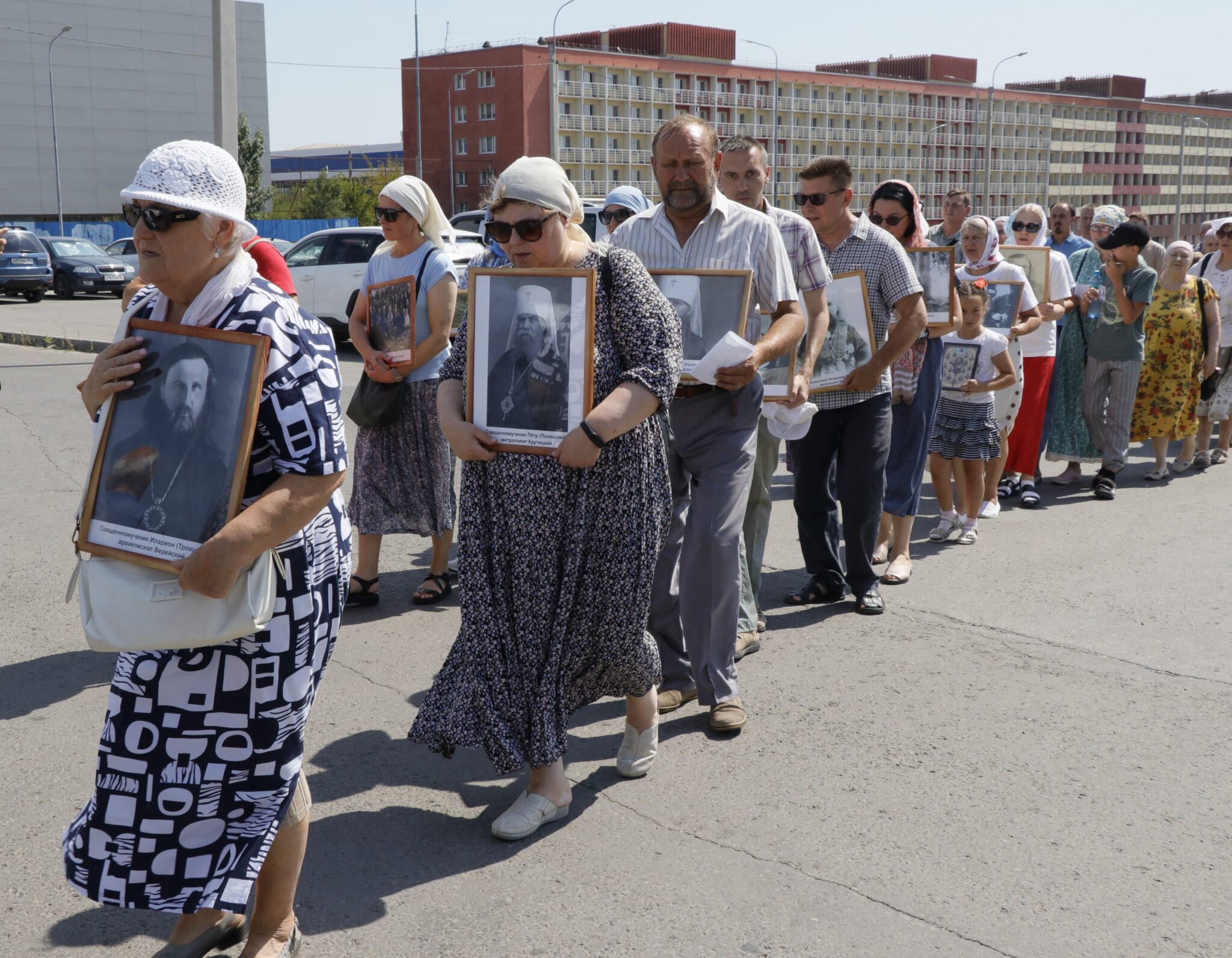 Верующие, пришедшие на молитву, и непосредственные участники Крестного хода во время богослужения держали в руках иконы и портреты святых Собора новомучеников и исповедников Церкви Русской. Святитель Тихон возглавляет сонм исповедников веры православной на российской земле.