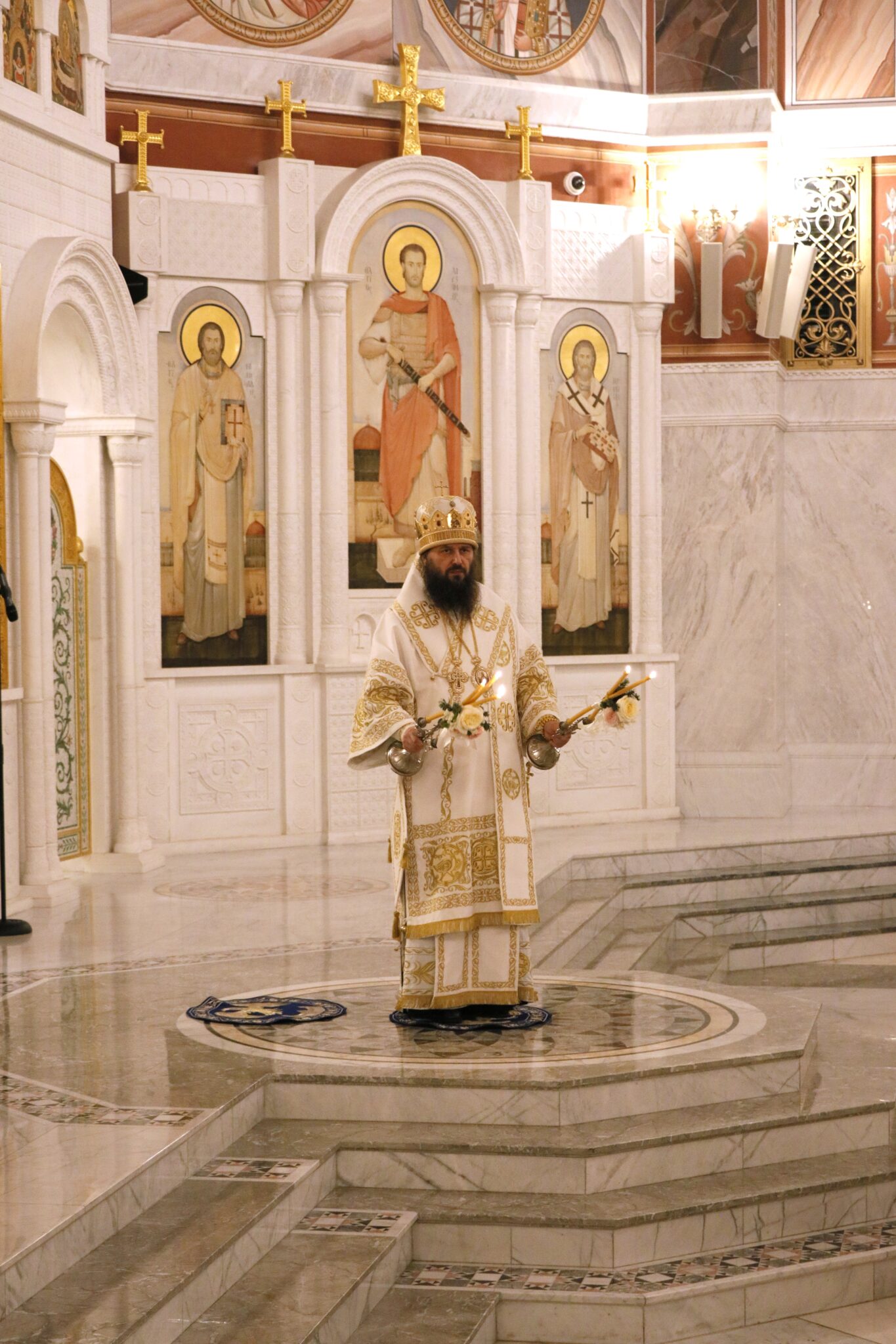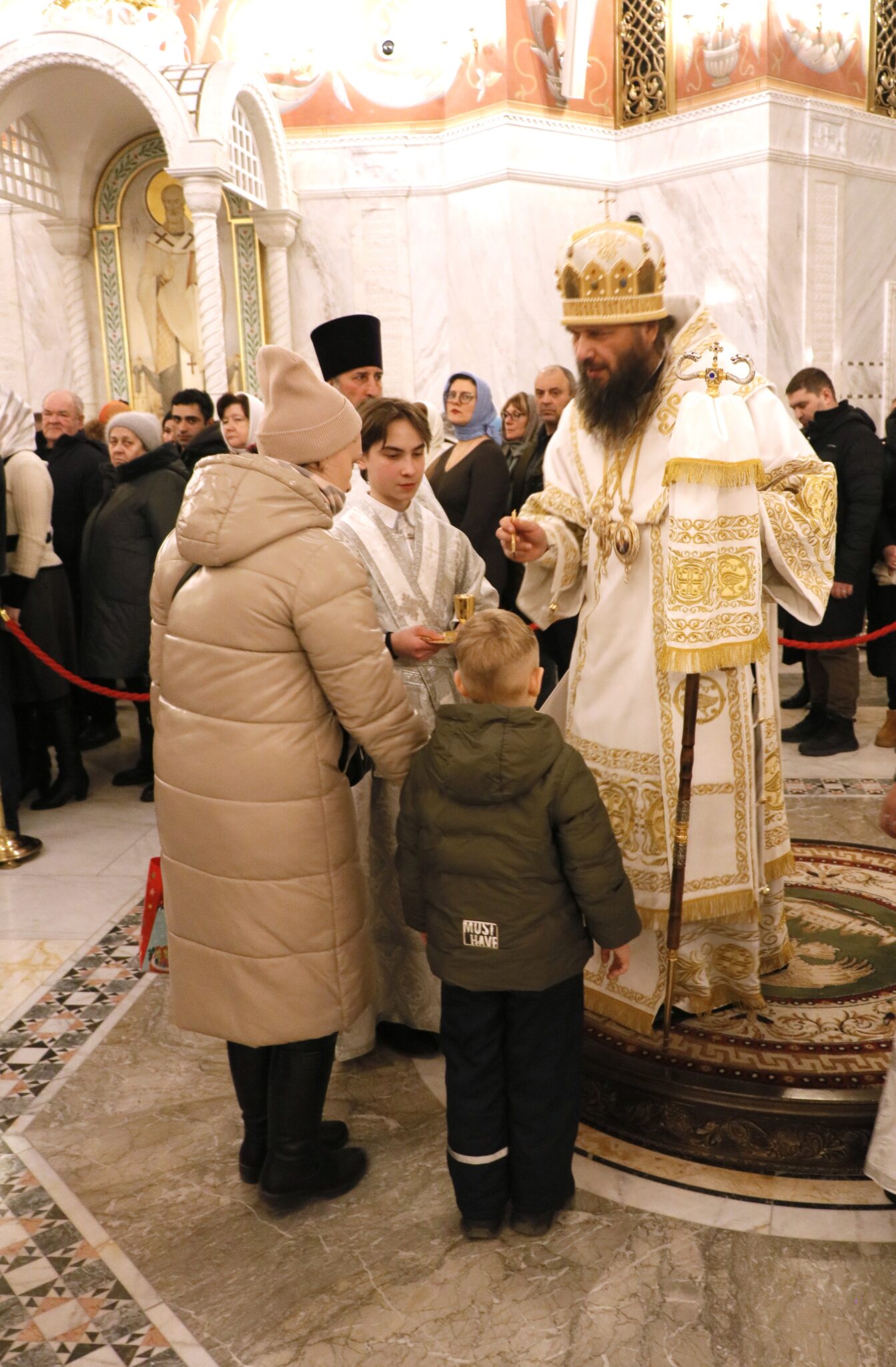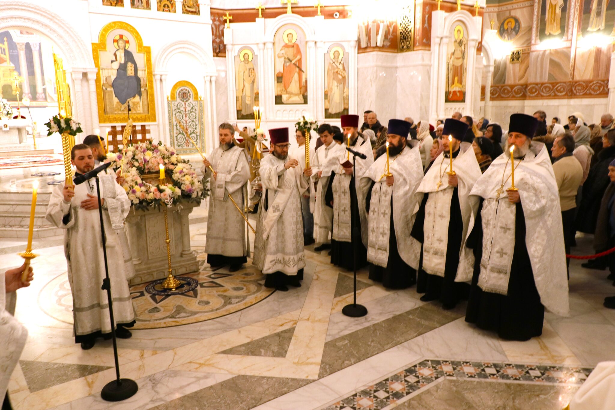 «Во Иордане крещающуся Тебе, Господи, Троическое явися поклонение: Родителев бо глас свидетельствоваше Тебе, возлюбленнаго Тя Сына именуя, и Дух в виде голубине, извествоваше словесе утверждение. Явлейся Христе Боже и мир просвещей, слава Тебе» — воспевало духовенство и хор перед иконой праздника.