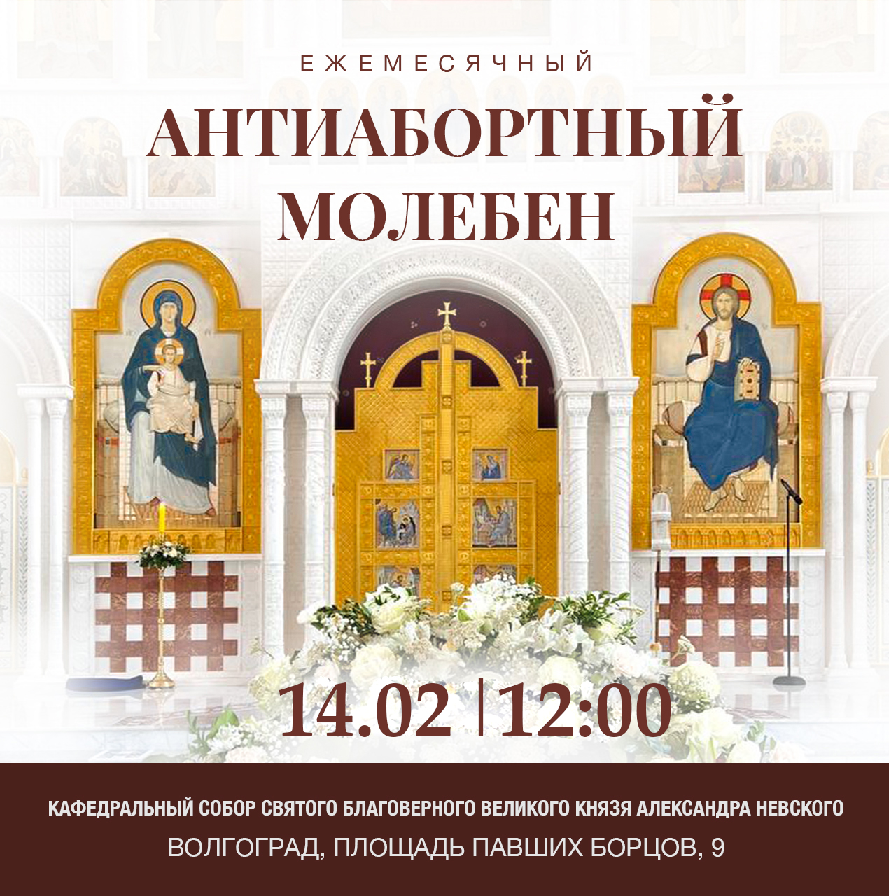 12.00 — молебен о прекращении и прощении греха детоубийства в кафедральном соборе святого благоверного князя Александра Невского;