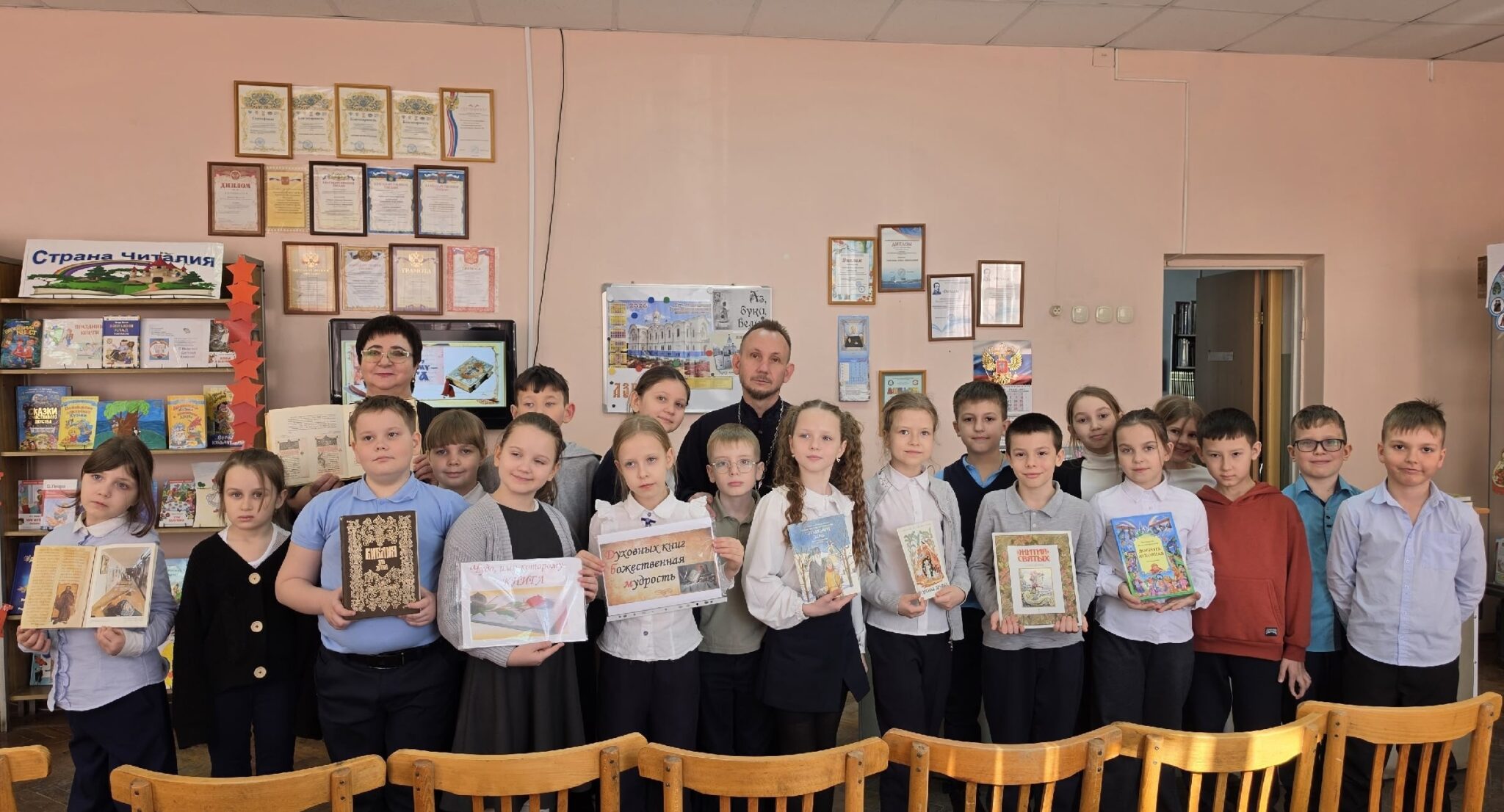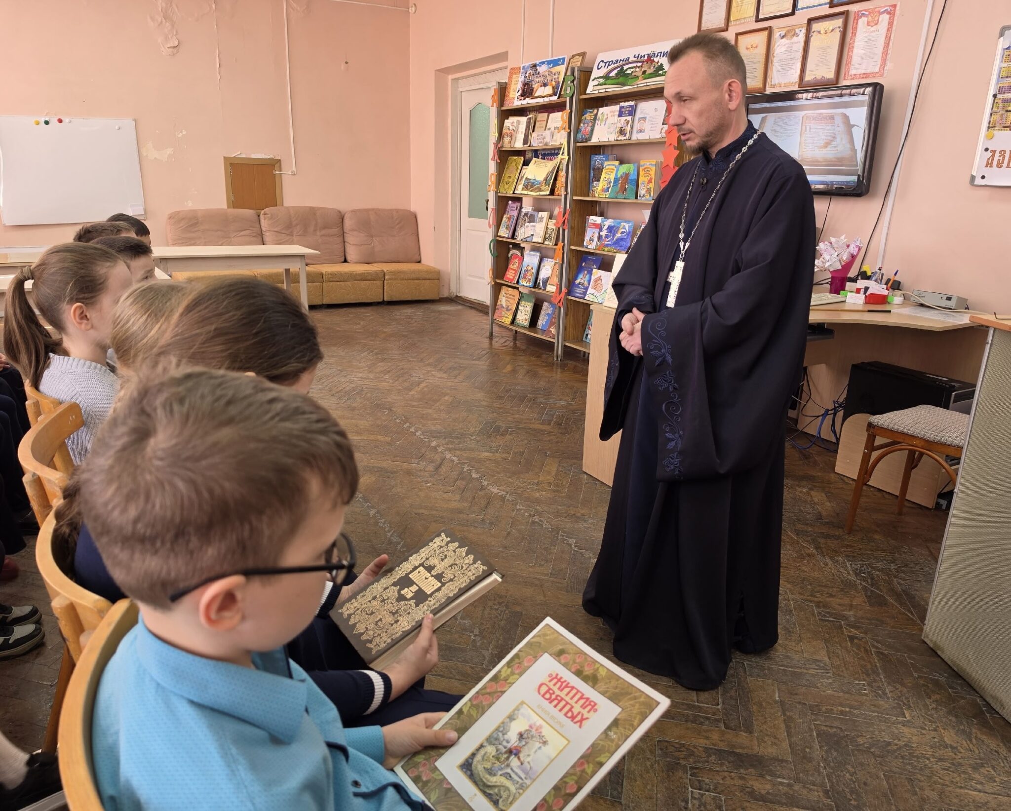 В читальном зале детской библиотеки № 2 Краснооктябрьского района города Волгограда для учеников 2 и 3 классов средней школы № 98 состоялось особенное мероприятие, посвященное Дню православной книги. Иерей Евгений Караваев, настоятель храма святых мучениц Веры, Надежды, Любови и матери их Софии города Волгограда, приоткрыл ребятам дверь в мир Православия через знакомство с литературой: