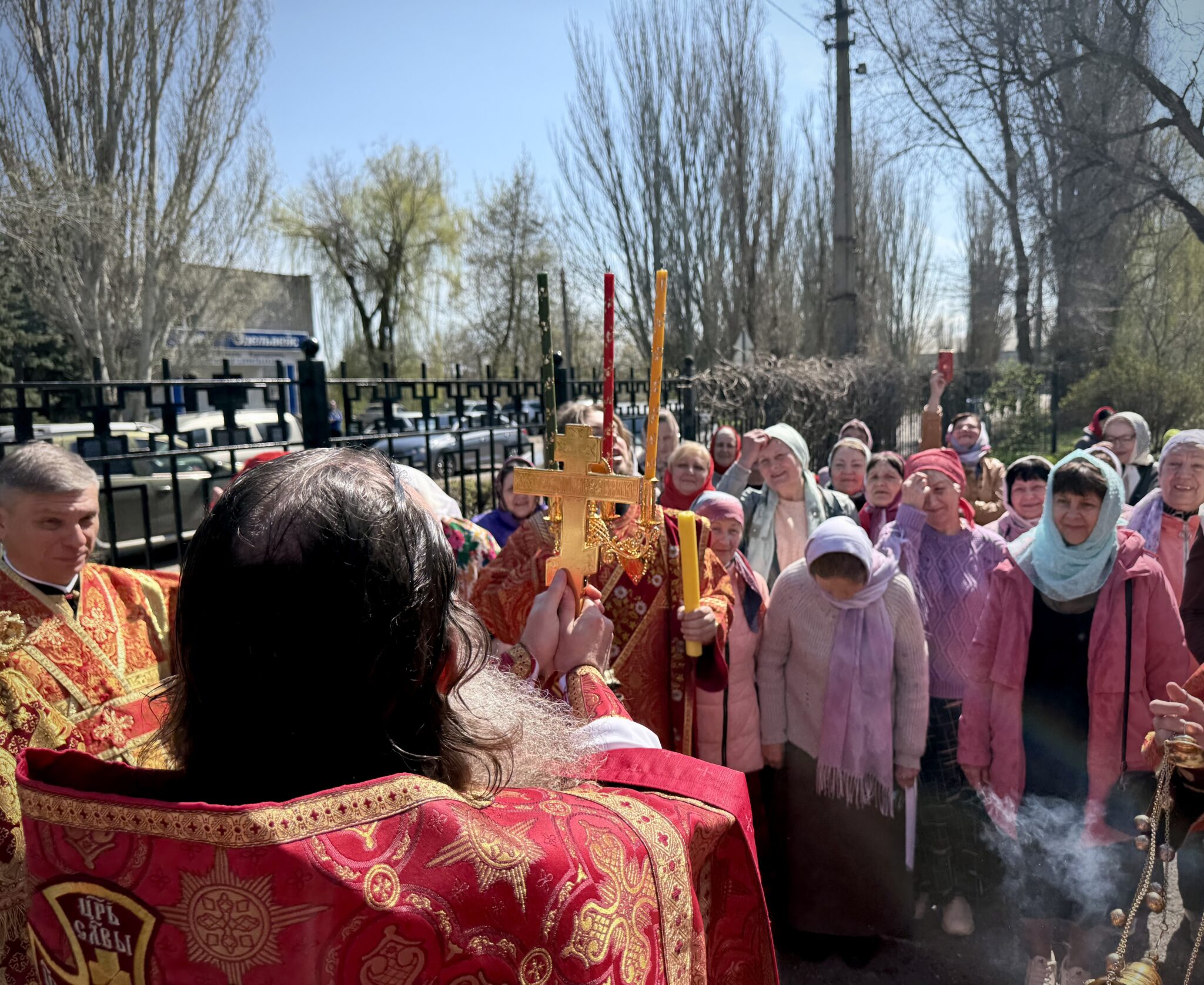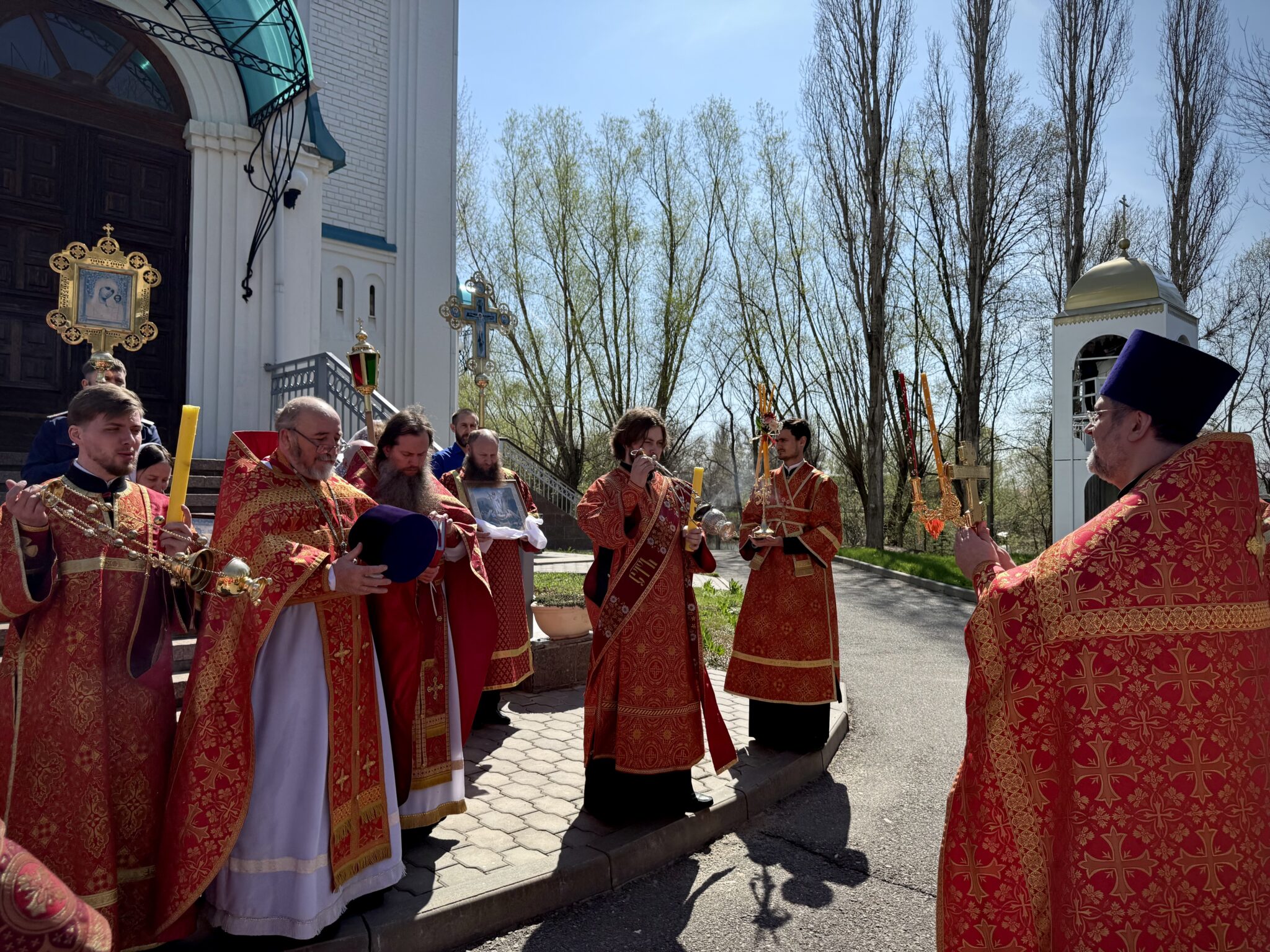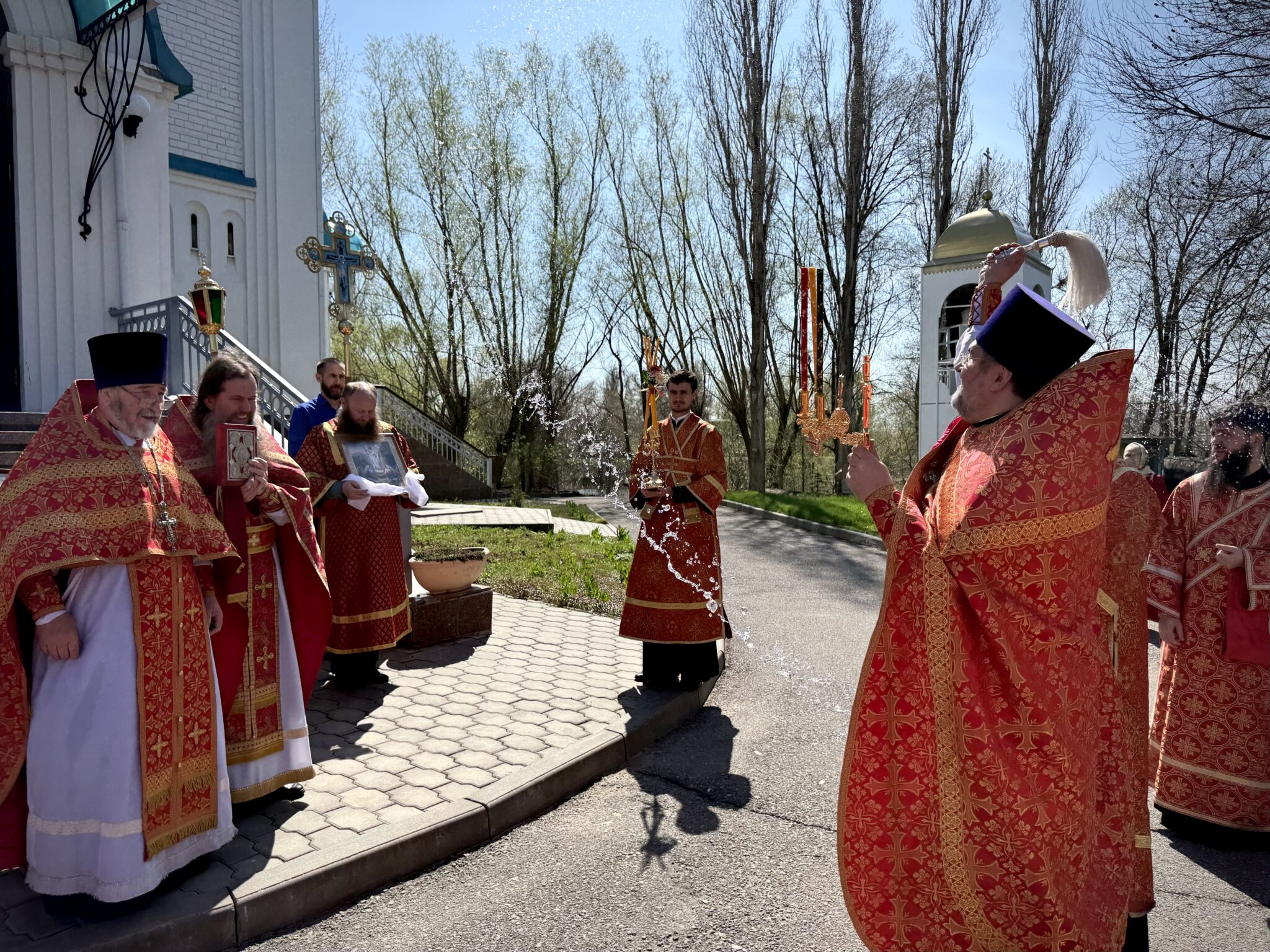Правящий архиерей, духовенство и прихожане прошли Крестным ходом вокруг храма, во время которого читались Евангельские отрывки о Воскресении Спасителя. Верующих окропляли святой водой.