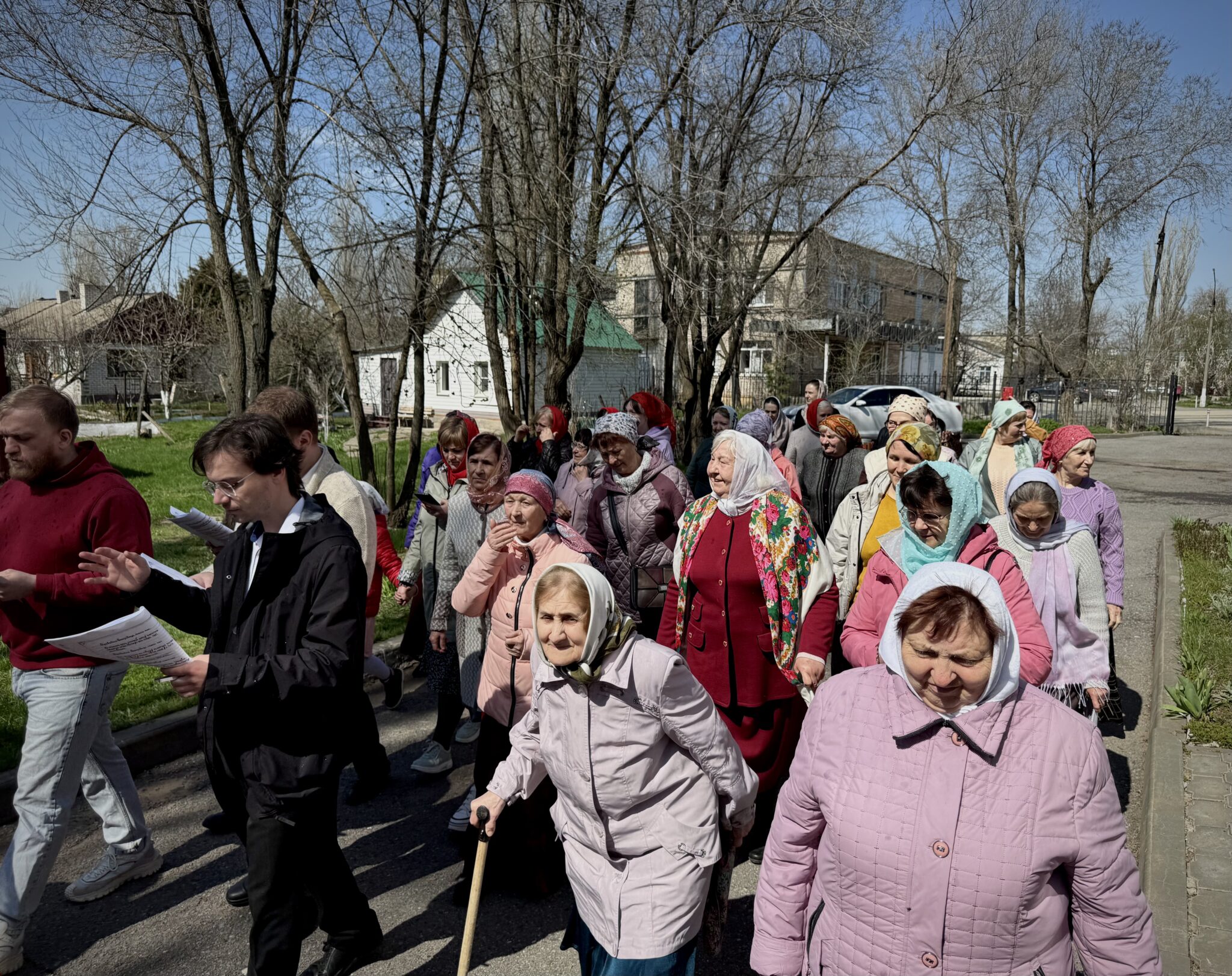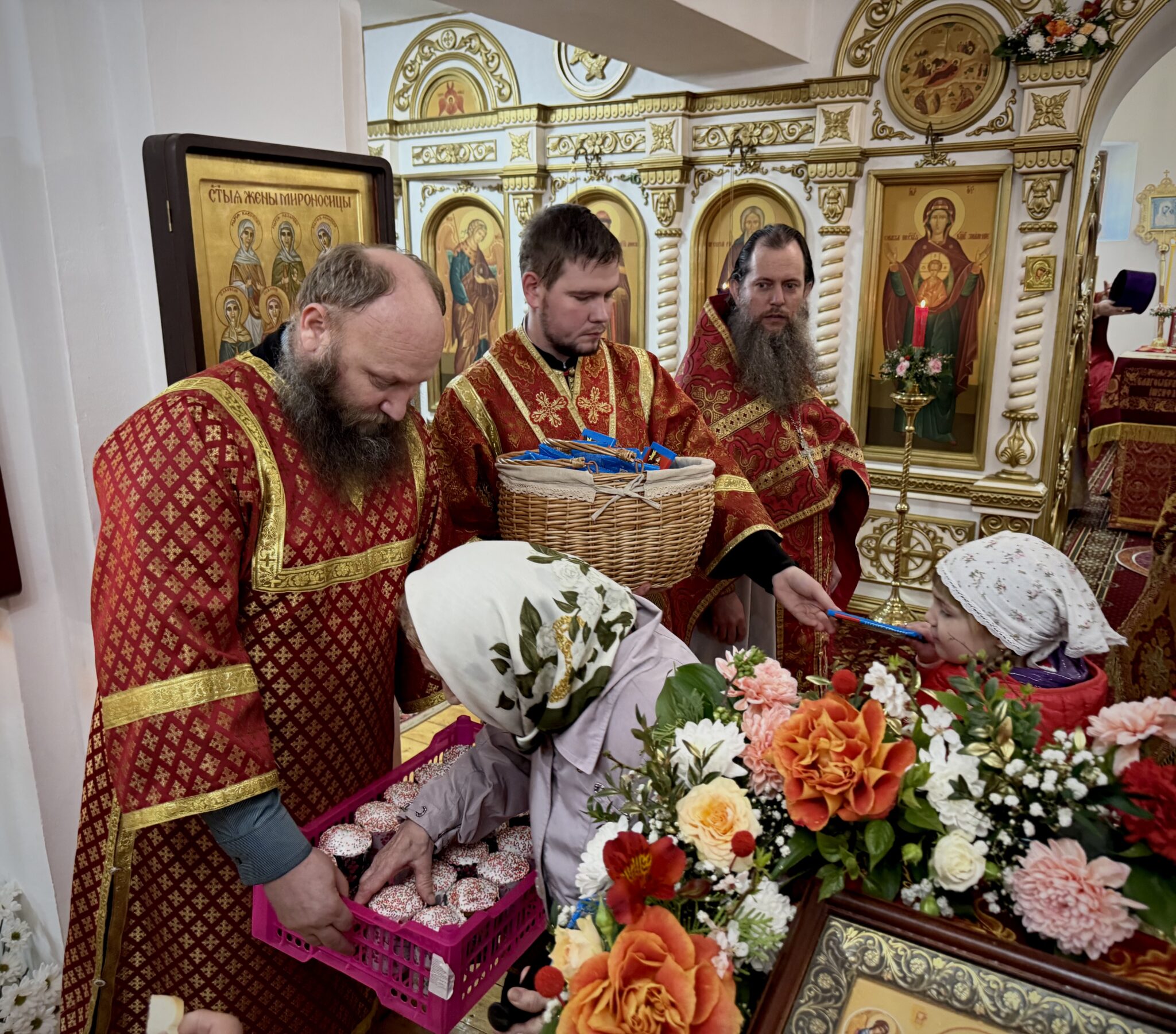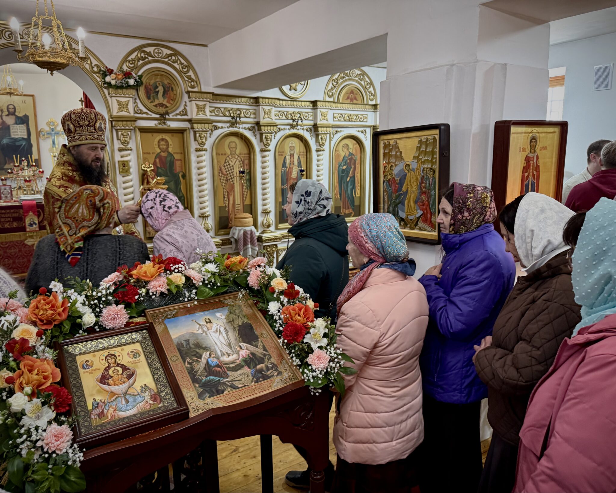 Правящий архиерей, духовенство и прихожане прошли Крестным ходом вокруг храма, во время которого читались Евангельские отрывки о Воскресении Спасителя. Верующих окропляли святой водой.