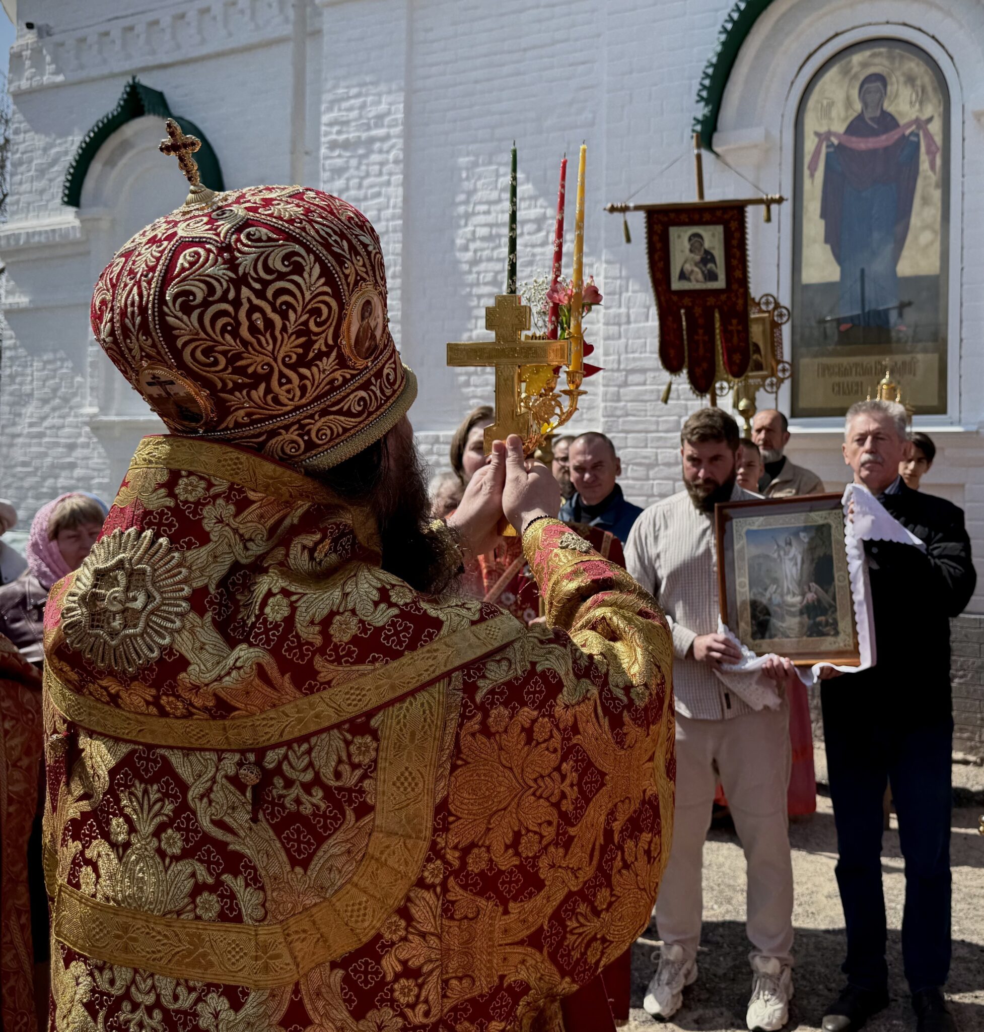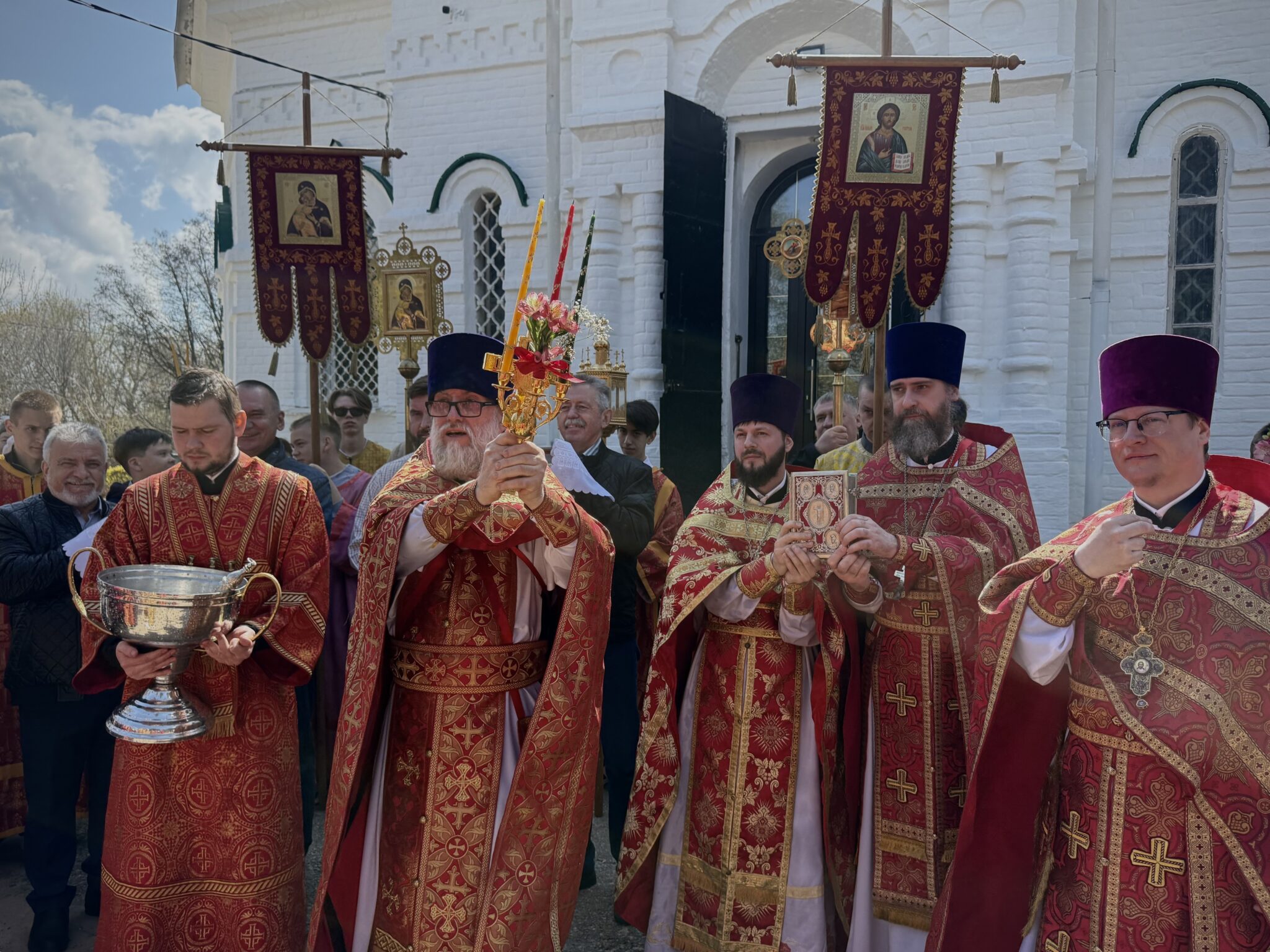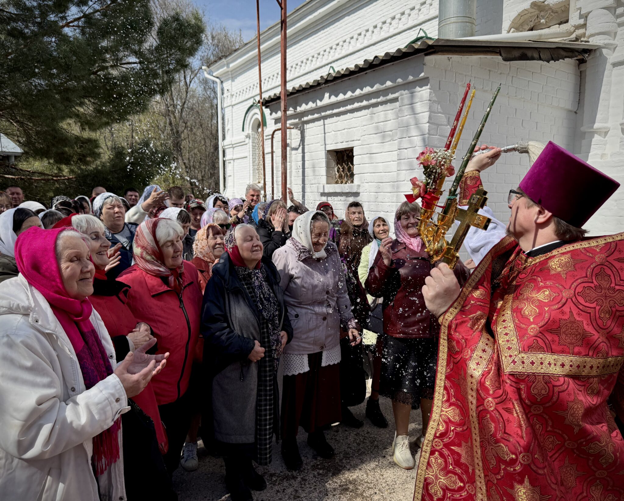 Верующие вместе с правящим архиереем и духовенством совершили Пасхальное победоносное шествие вокруг храма, освящая все вокруг молитвой, Пасхальным ликованием, с радостью принимая окропление святой водой.