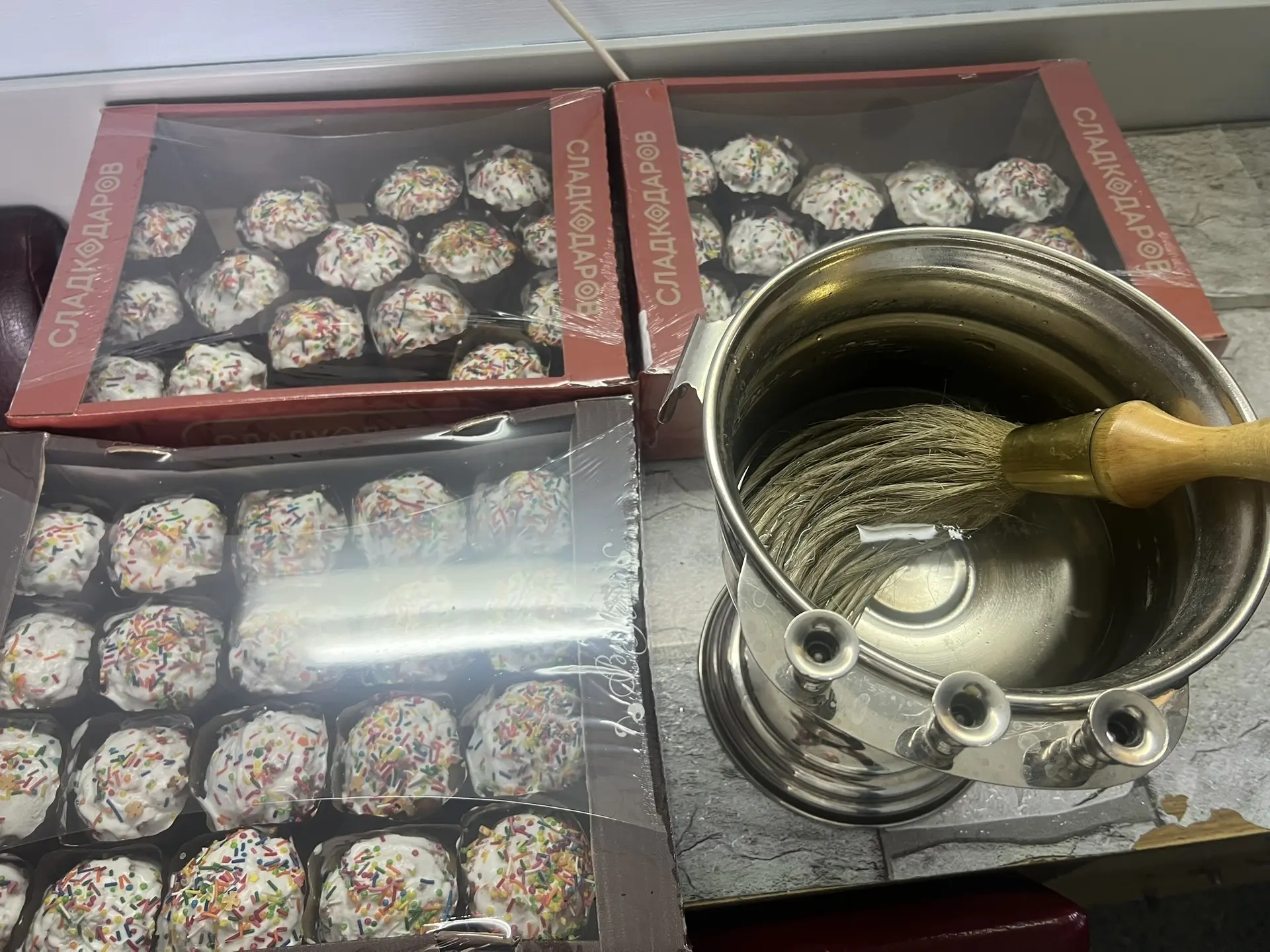 Для всех желающих священнослужитель и благотворители подготовили небольшие Пасхальные подарки и традиционные куличи.